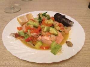 I definitely cook a lot less now that I more or less live in a hotel. But once in a while I do whip something up. Here is a delicious dinner of trout I made the other day, with a topping of shrimp, mussels, peppers, and zucchini. The fish at the Mercado Central is very good and I am delighted to know where to get good fish in this rather meat centric country.