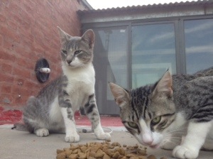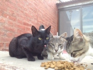 Or rather, on a cement roof. It was funny to take a photo of them from this angle! Unfortunately one of the dogs killed another cat two days ago. 😦