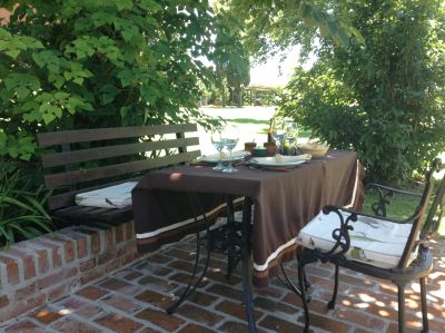 At this estancia, as in many others, meals are often served at one big table where guests mingle and chat and get to know each other. However, not everyone wants that; especially the Argentine guests prefer to sit by themselves. When we have a lot of people, it means we need to get very creative with seating arrangements, since we only have so many tables and so many shady spots where someone can sit. Here is one version of a table for two; two small tables pushed against a little bench. With an extra chair and a table cloth; voila.